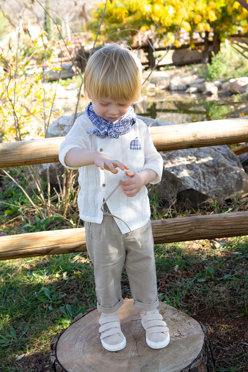 Ο Floyd είναι ένα ιδιαίτερο κοστούμι βάπτισης στο χρώμα της μόκας. Αποτελείται από cotton παντελόνι και εκρού ιδιαίτερη loose fit πουκαμίσα από γάζα εξαιρετικής ποιότητας. Αξεσουάρ το καρό φουλάρι και το λευκό ψάθινο καβουράκι για το κεφάλι.