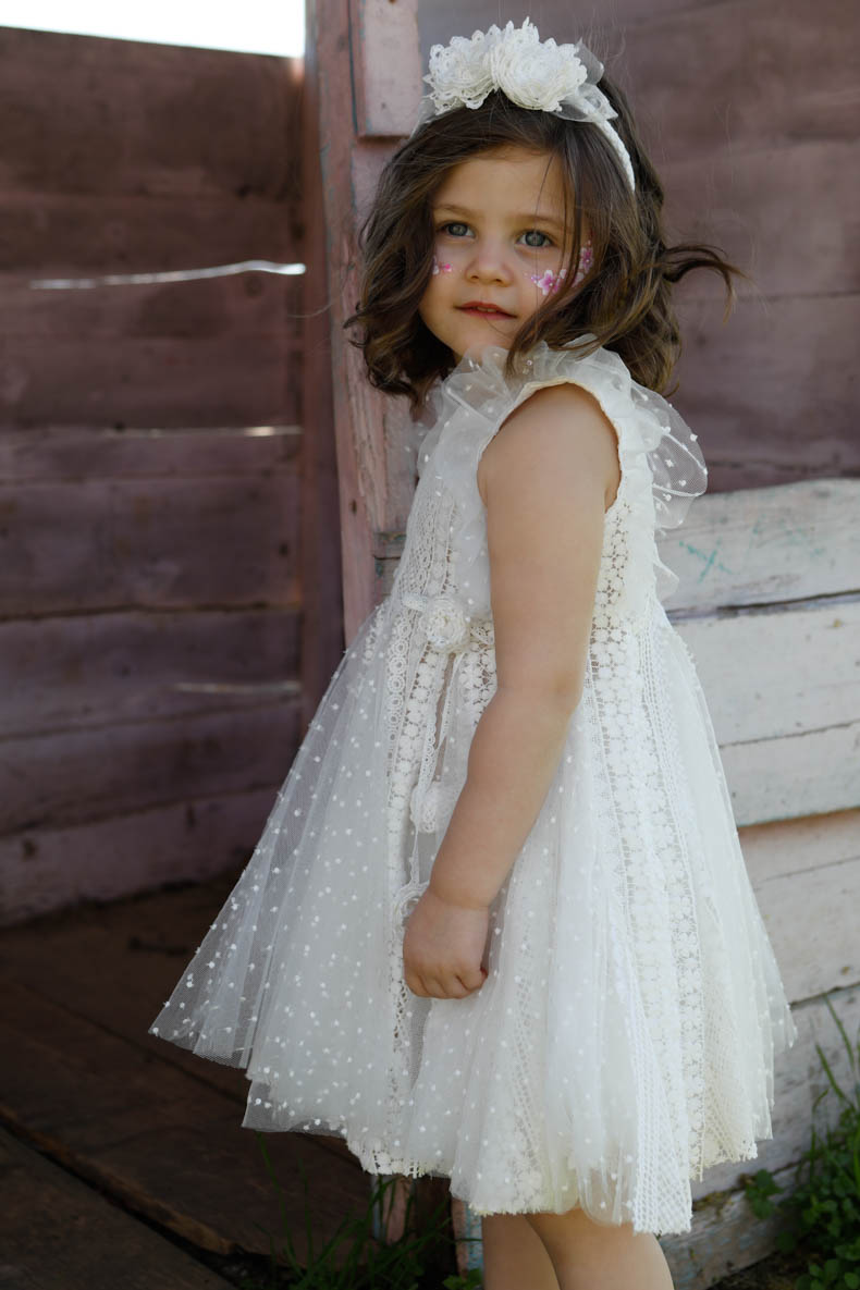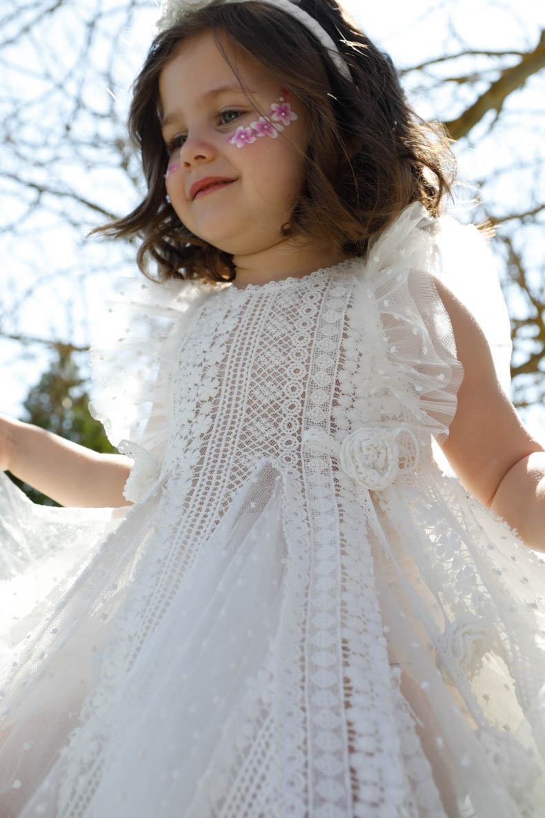 Exclusive εκρού φόρεμα σε άλφα γραμμή με boho στυλ. Butterfly μανίκια. Πουά τούλι συνδυασμένο με μακρεμέ δαντέλα και στολισμό απο βαμβακερή δαντέλα. Αξεσουάρ: Στέκα με χειροποίητα βαμβακερά λουλούδια. Σύνθεση υφασμάτων: Δαντέλα μακρεμέ Ιταλίας, Πουά τούλι Ιταλίας, 100% Cotton. Ελληνικής ραφής.